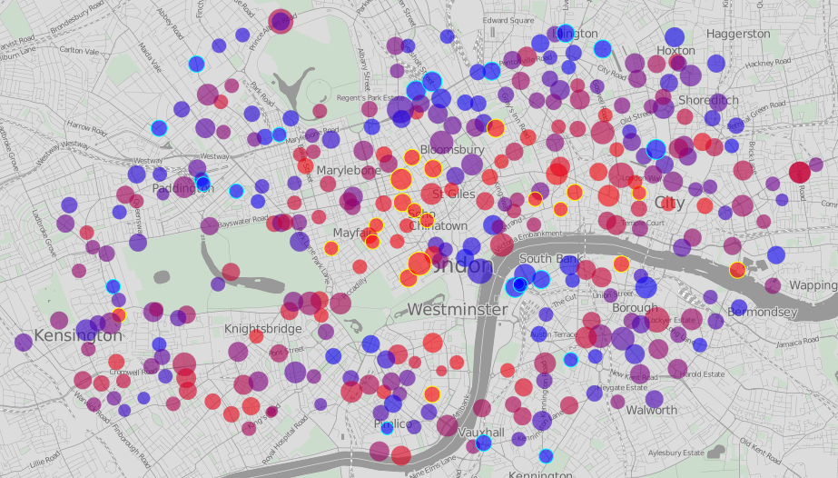 Finally, the image below shows how the cycle stations looked at 9:25 this morning. Blue indicates empty and red indicates full, whilst those circles with an aqua blue border indicate completely full and those with a yellow border completely empty.