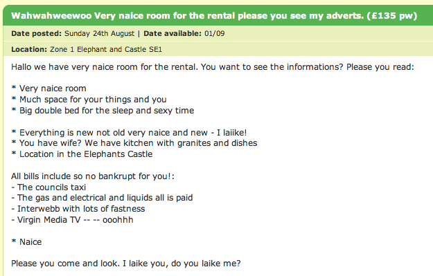 Wahwahweewoo Very naice room for the rental please you see my adverts. August 24, 2008 AndyNo Comments As found on Gumtree. Hilarious.